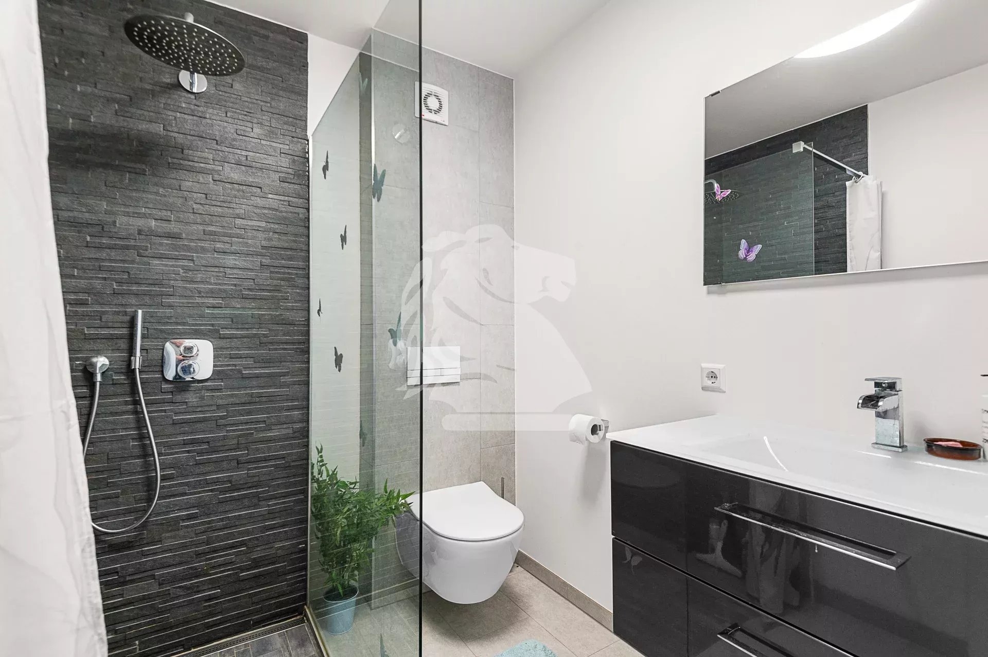 Upon entering the ground floor, you are greeted by a hallway leading to a spacious bedroom on the left and a modern shower room with toilet and washing machine connection on the right. The main living area consists of a bright living room and a dining room opening onto a fully equipped kitchen. This living area has direct access to a terrace and a fully enclosed private garden of 120 m², ideal for enjoying sunny days in complete tranquillity.