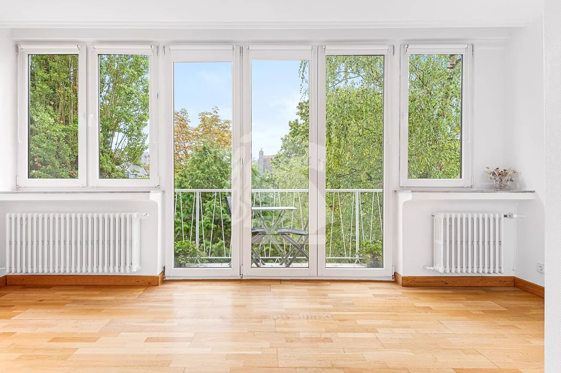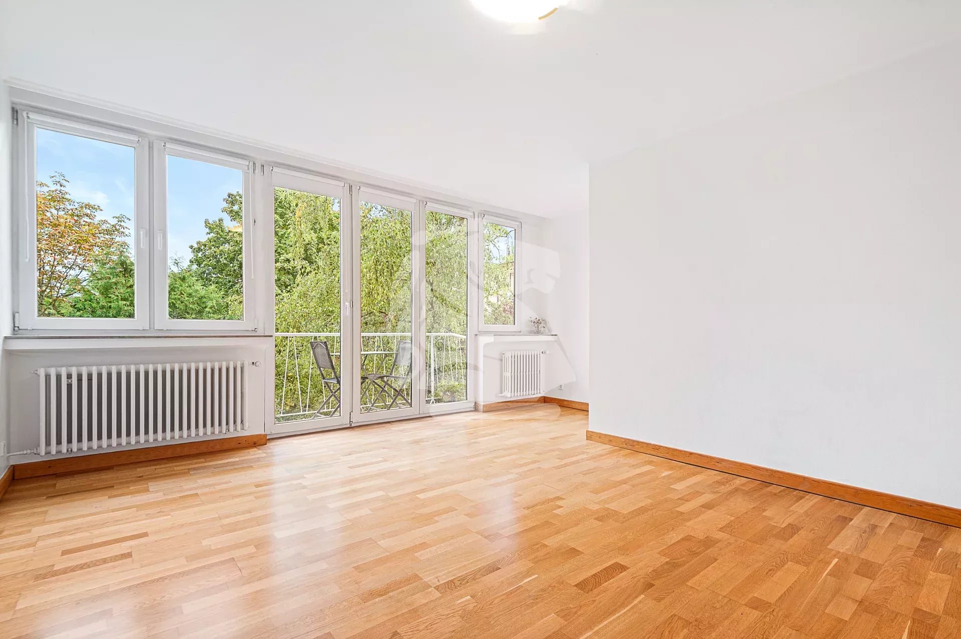 On the right-hand side, the parquet-floored living room opens onto a small, intimate balcony facing the trees, without overlooking neighbours, creating a peaceful atmosphere. The quiet bedroom, featuring a built-in wardrobe, completes the sleeping area.