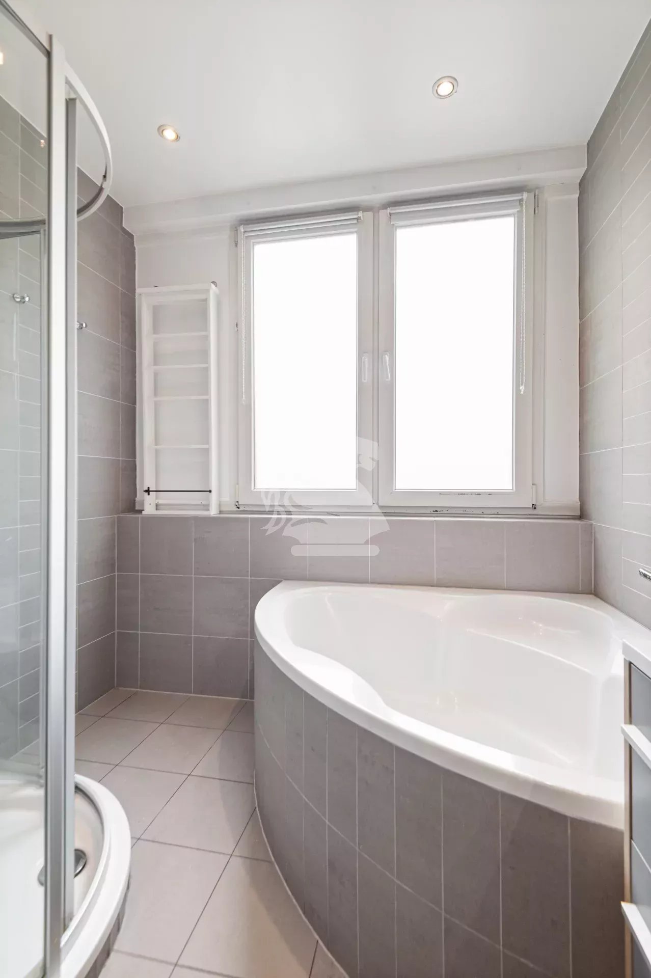 A separate WC and a modern, elegantly fitted shower room with a window, corner bathtub, and separate shower complete this area.