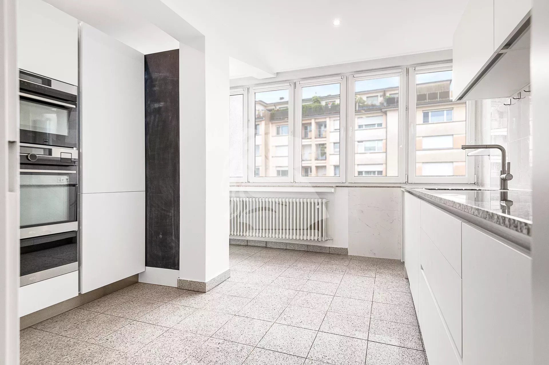 The property comprises two generous main rooms, wooden parquet flooring, an elevator with only one apartment per floor over four levels, as well as a spacious, private and enclosed cellar.