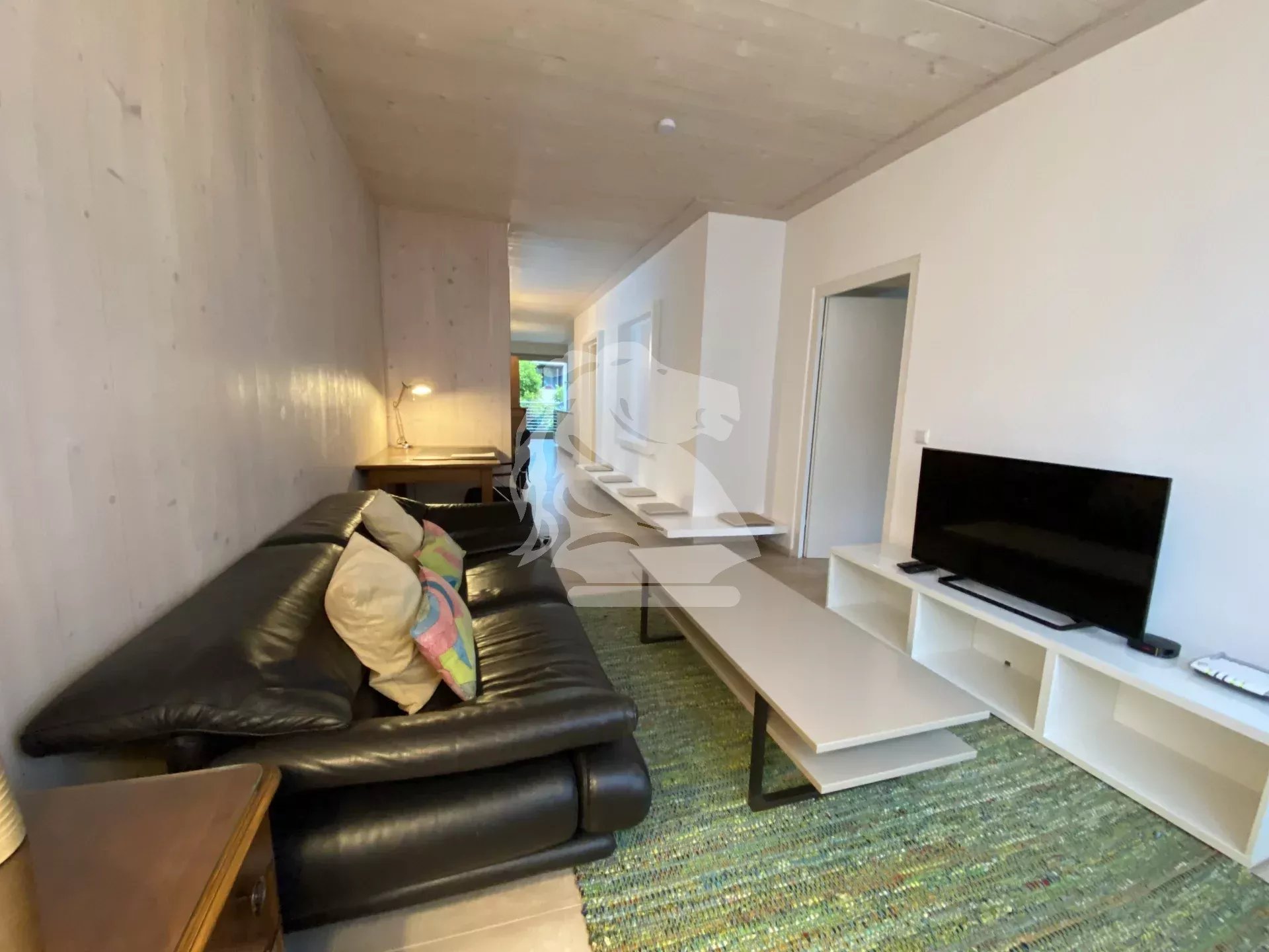 Le salon est constitué d’un canapé, d’un meuble TV, d’un écran plat et son décodeur, d’un bureau et des rangements.