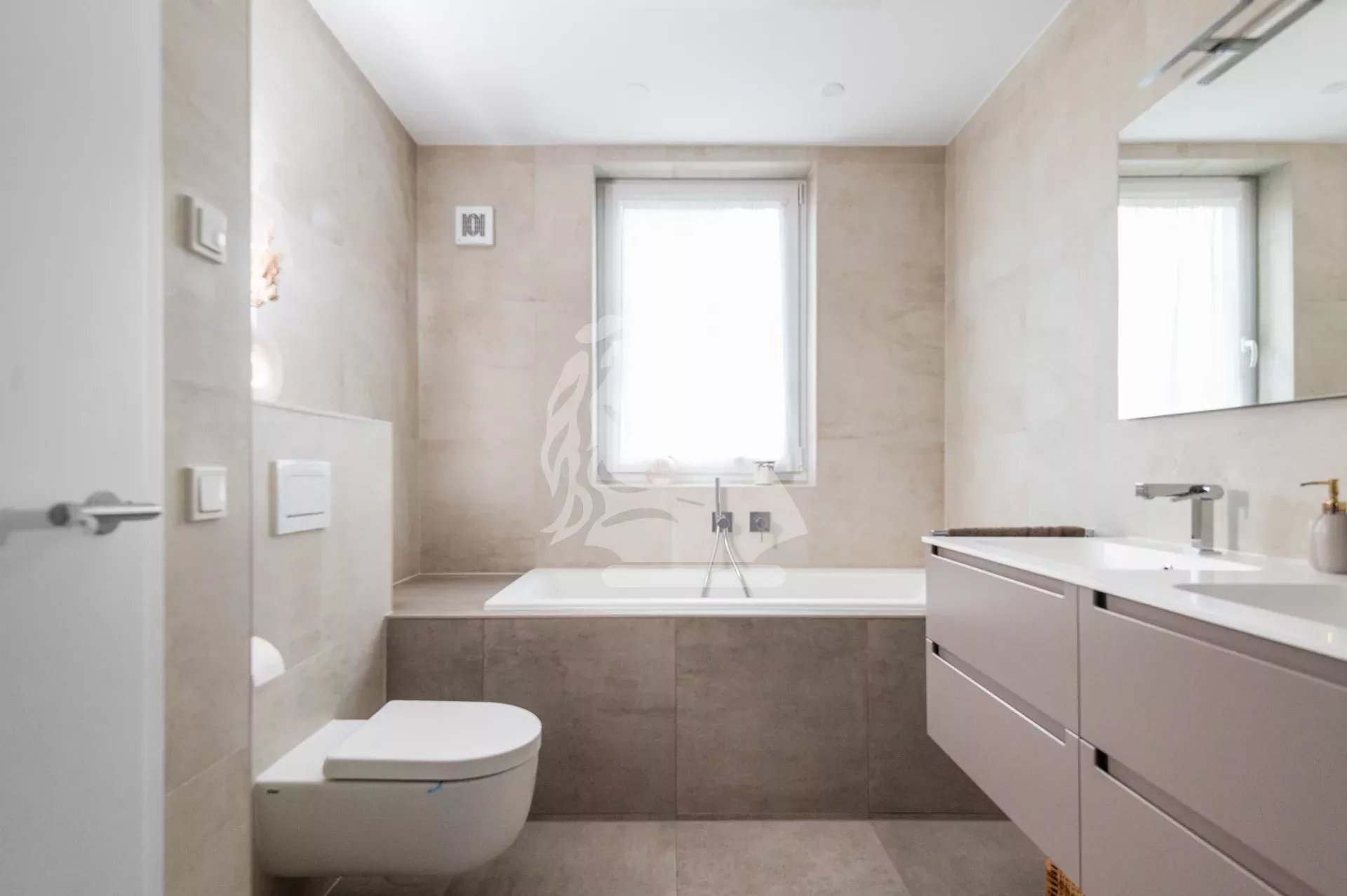 A fully equipped bathroom with bathtub, shower, WC and double washbasin
