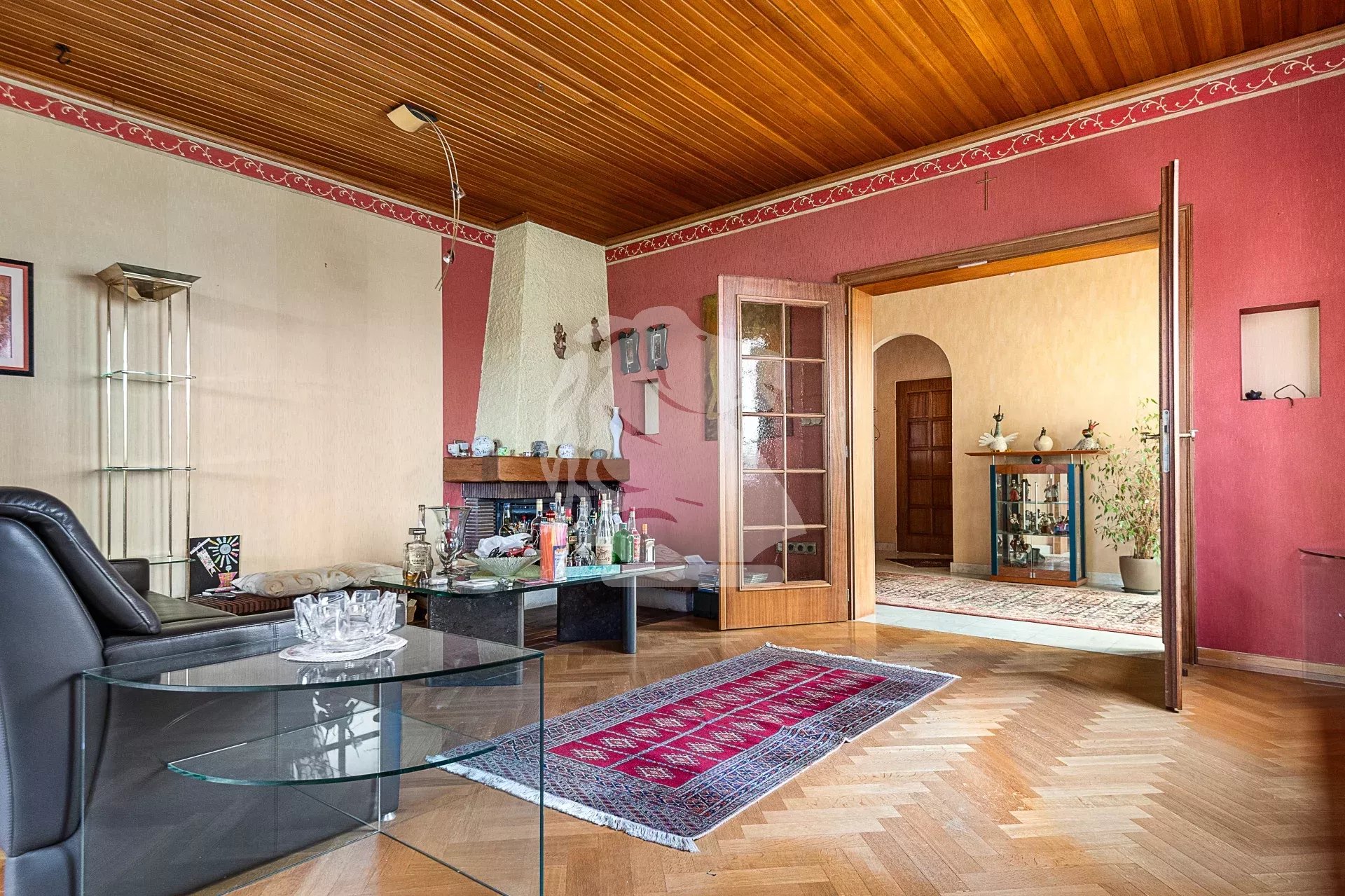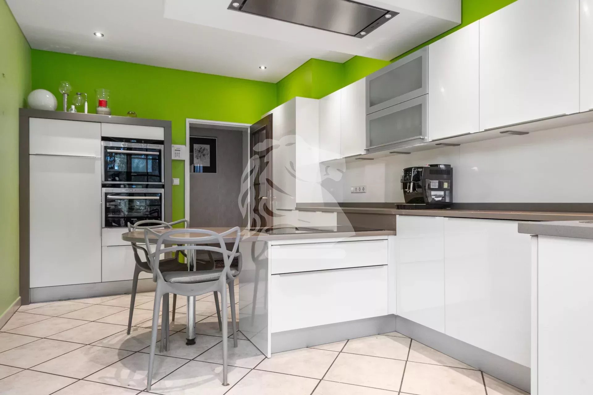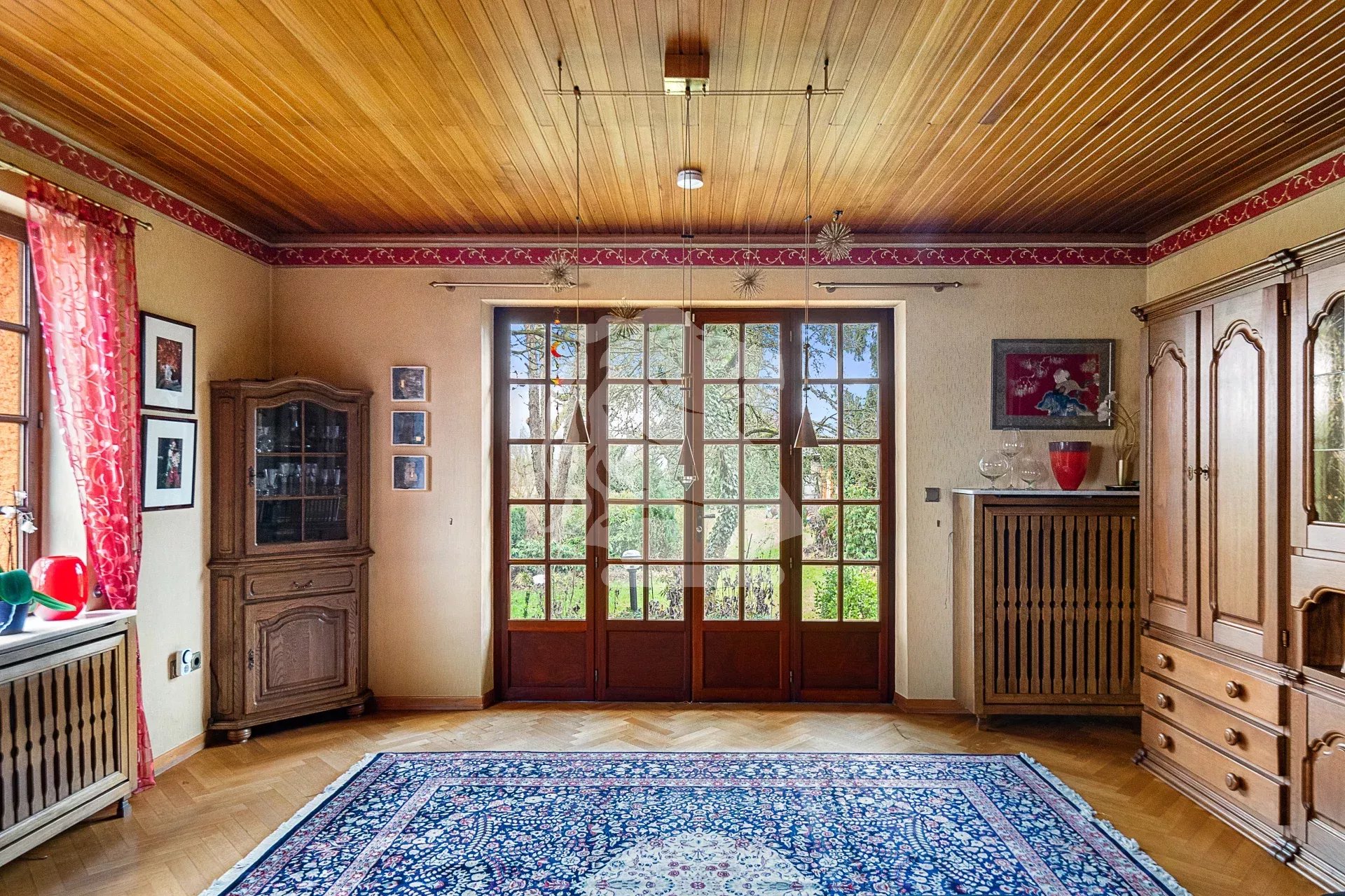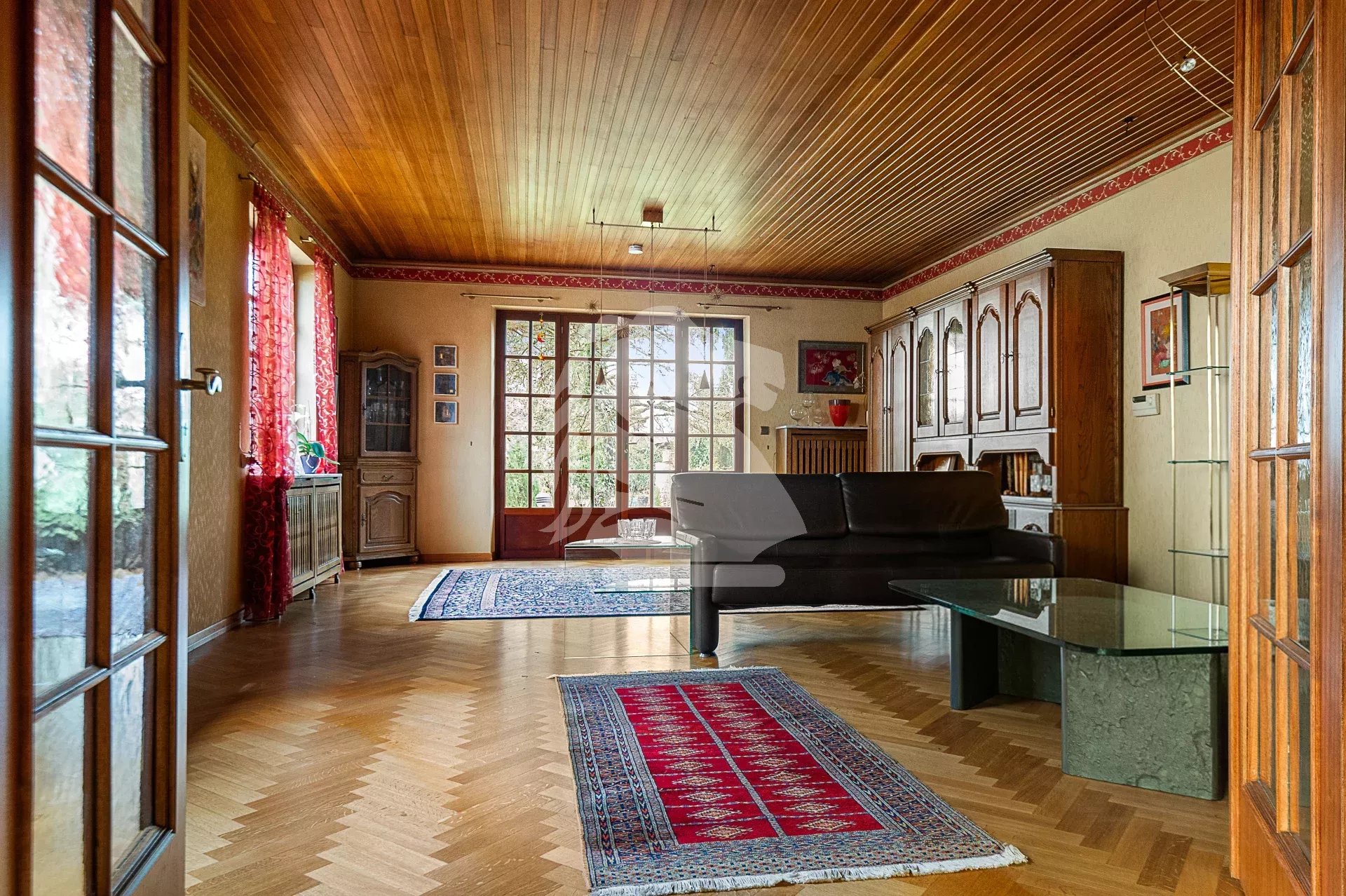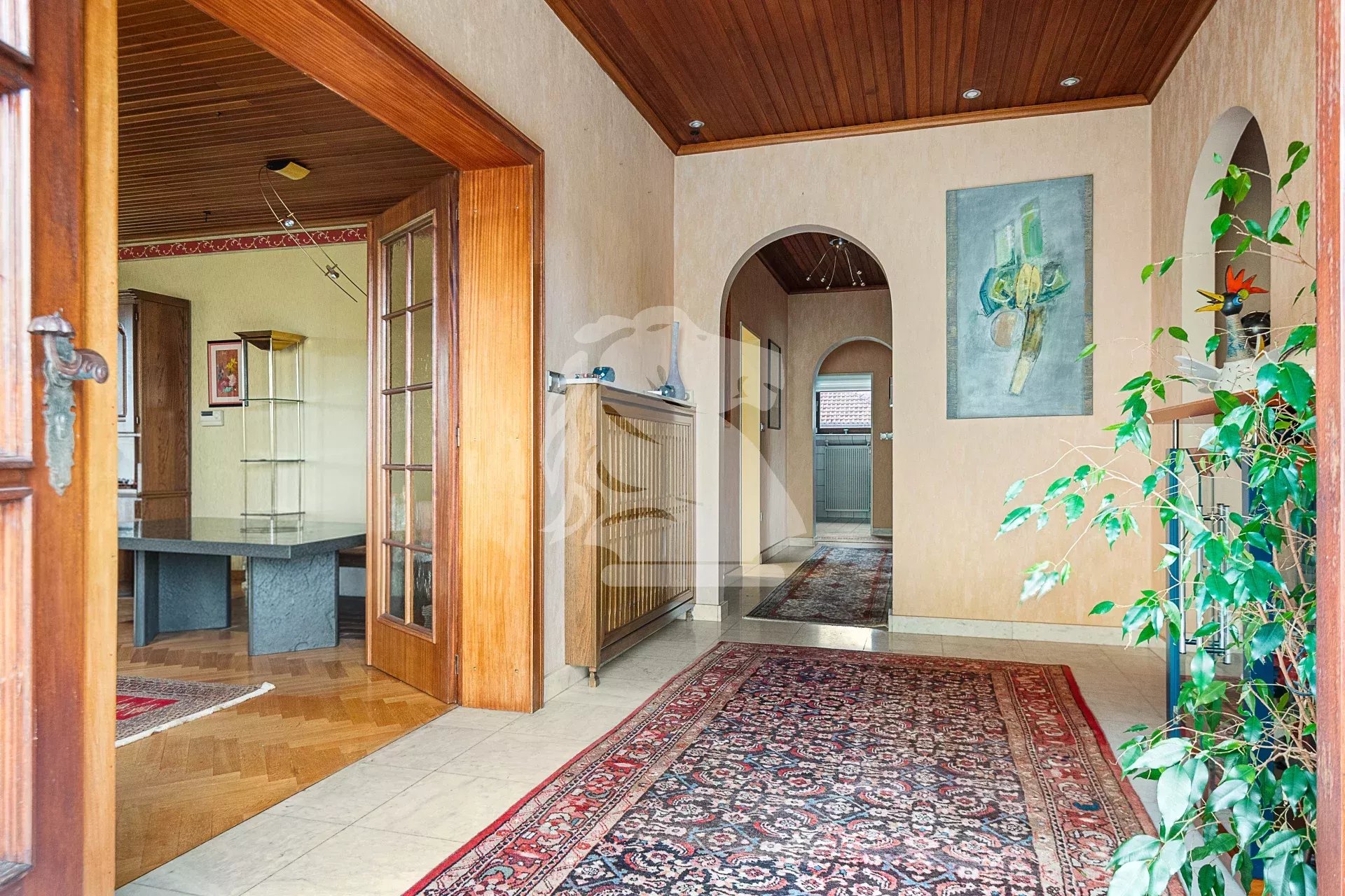 Au rez-de-chaussée, le hall d’entrée dessert harmonieusement les pièces. Sur la gauche, le salon bénéficie d’une cheminée et d’un accès direct à la terrasse et au jardin. La cuisine séparée, fonctionnelle, dispose elle aussi d’un accès direct à la terrasse, idéale pour les repas aux beaux jours.