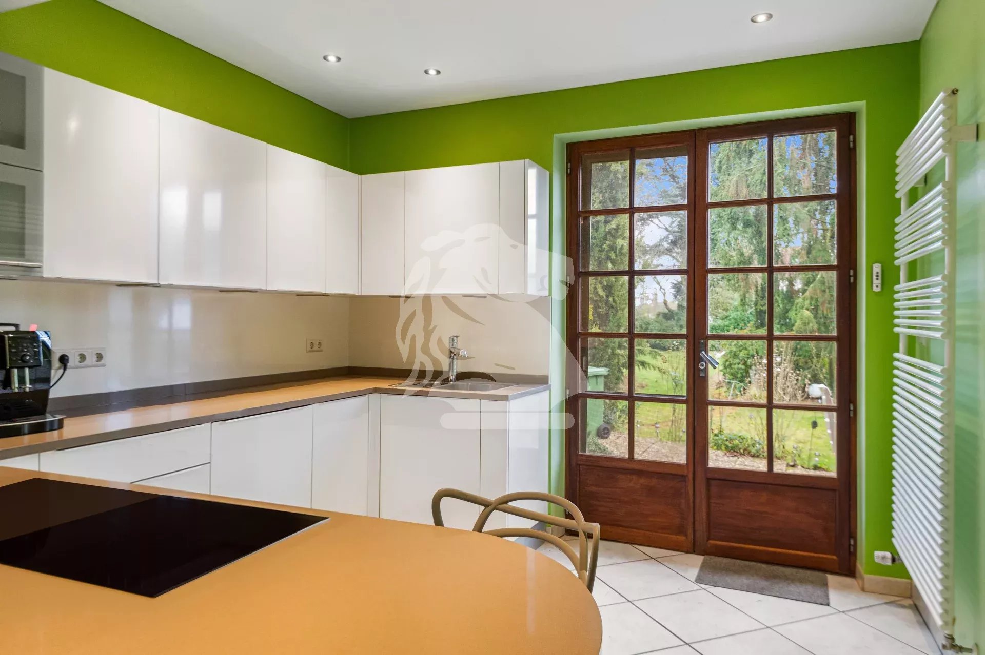 Au rez-de-chaussée, le hall d’entrée dessert harmonieusement les pièces. Sur la gauche, le salon bénéficie d’une cheminée et d’un accès direct à la terrasse et au jardin. La cuisine séparée, fonctionnelle, dispose elle aussi d’un accès direct à la terrasse, idéale pour les repas aux beaux jours.