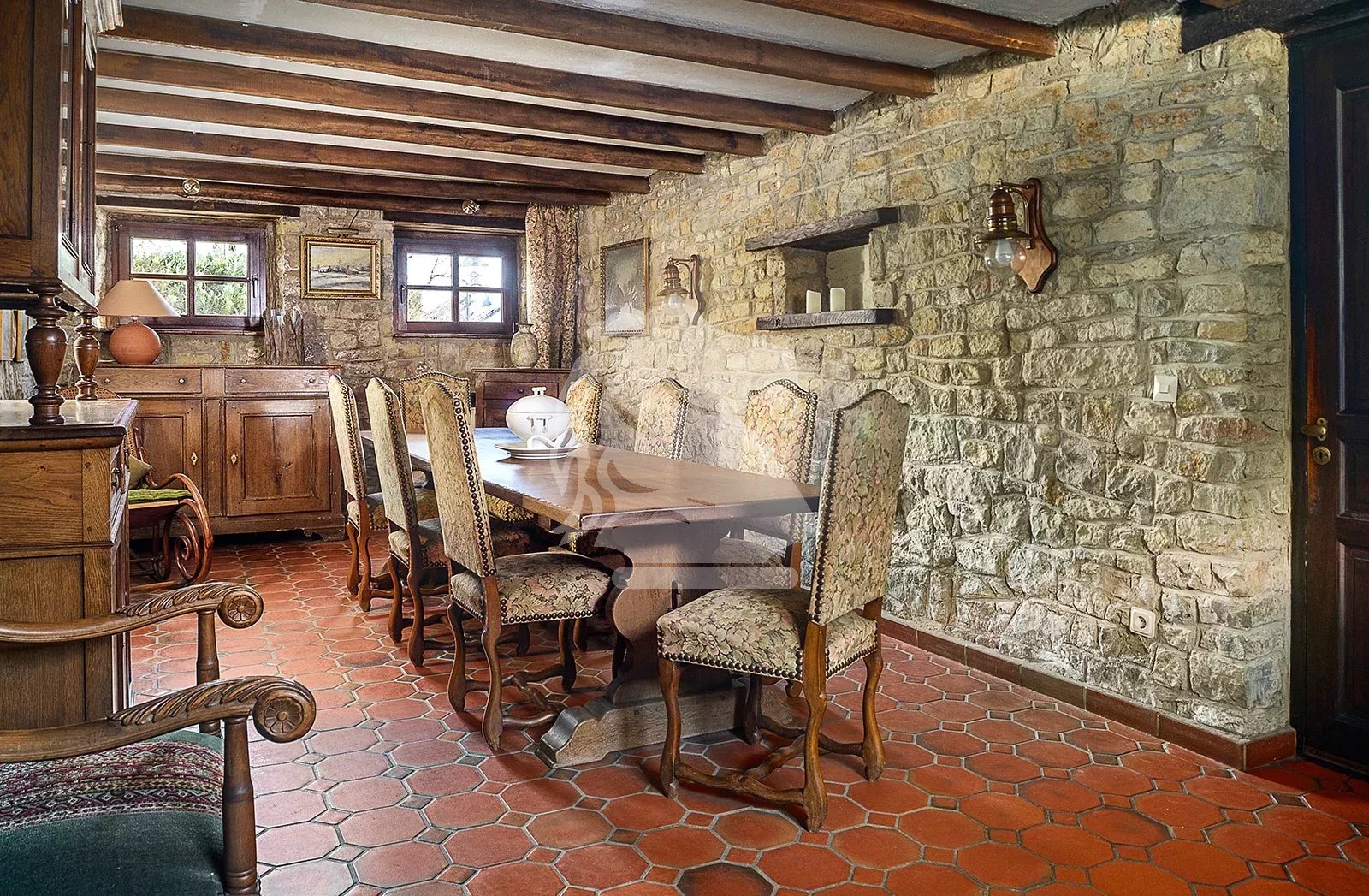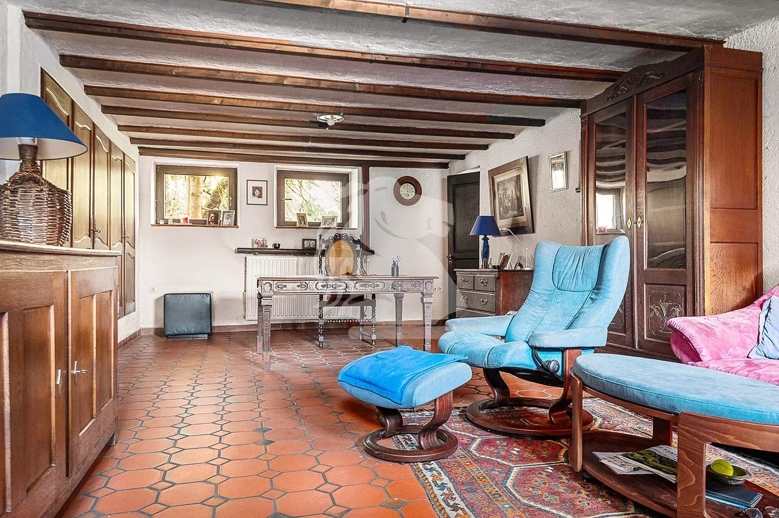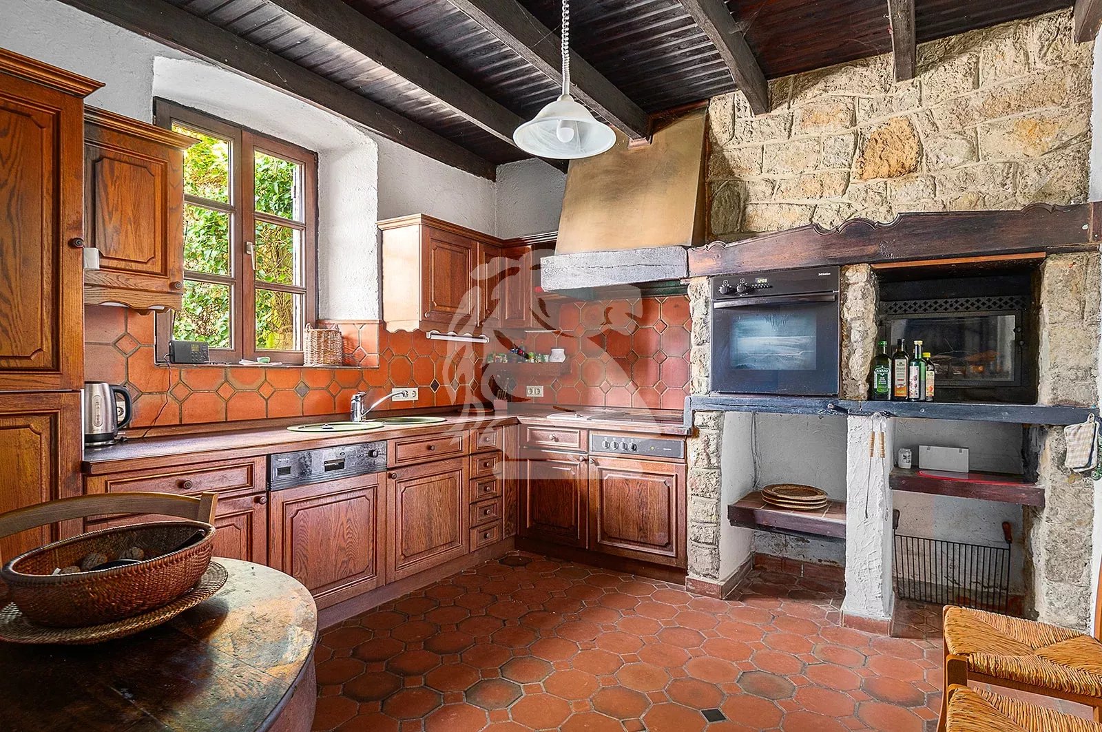 The house is equipped with two heating systems (oil and wood) and two fireplaces, one of which can be used as a barbecue.