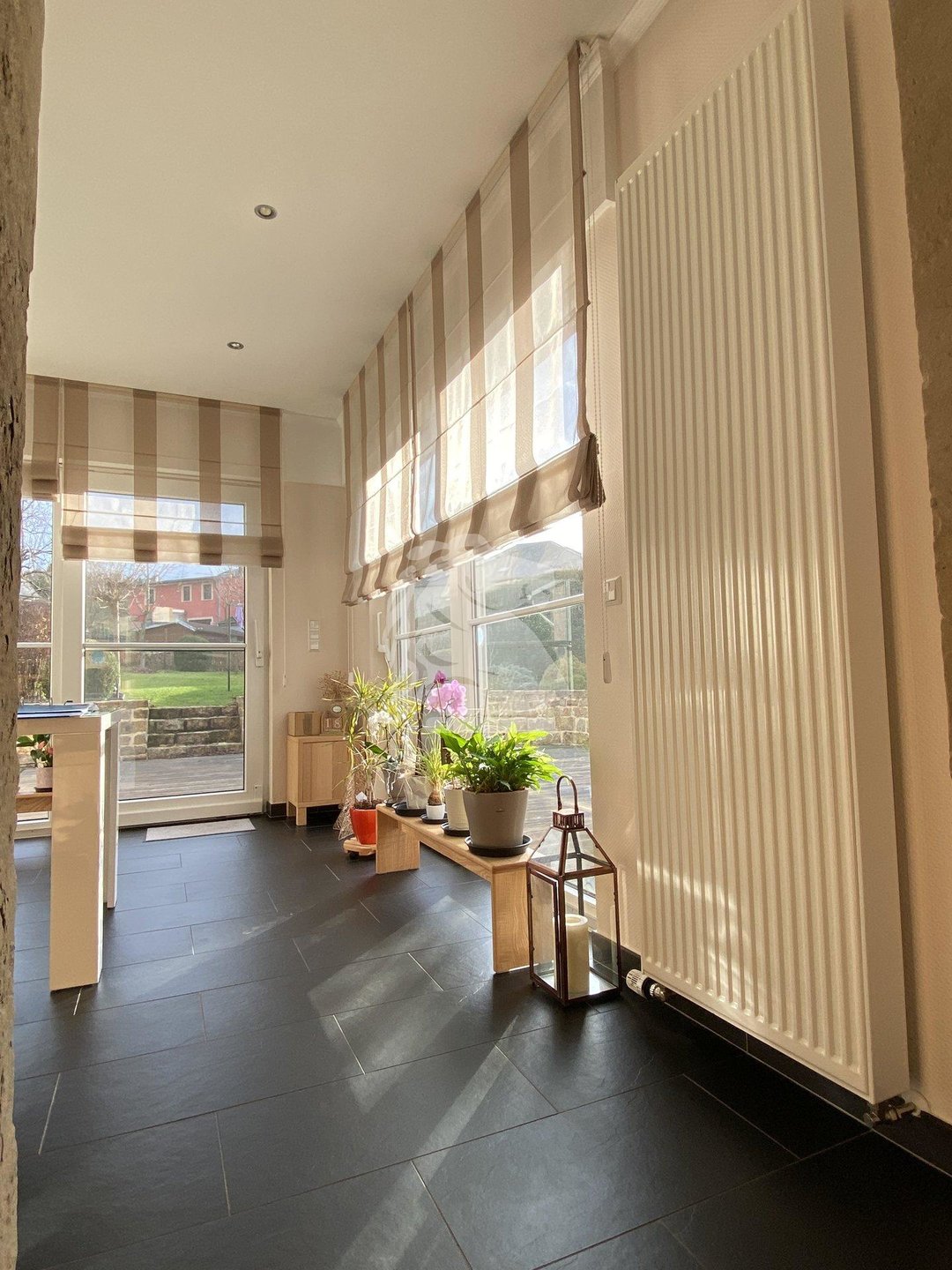 Le hall d’entrée central donne sur, côté gauche: un bureau à l’avant et une cuisine vers l’arrière. Au bout du hall, le jardin d’hiver – salle à manger s’ouvre sur le jardin. Du côté droit du hall, une salle à manger-séjour traverse la maison de l’avant à l’arrière.